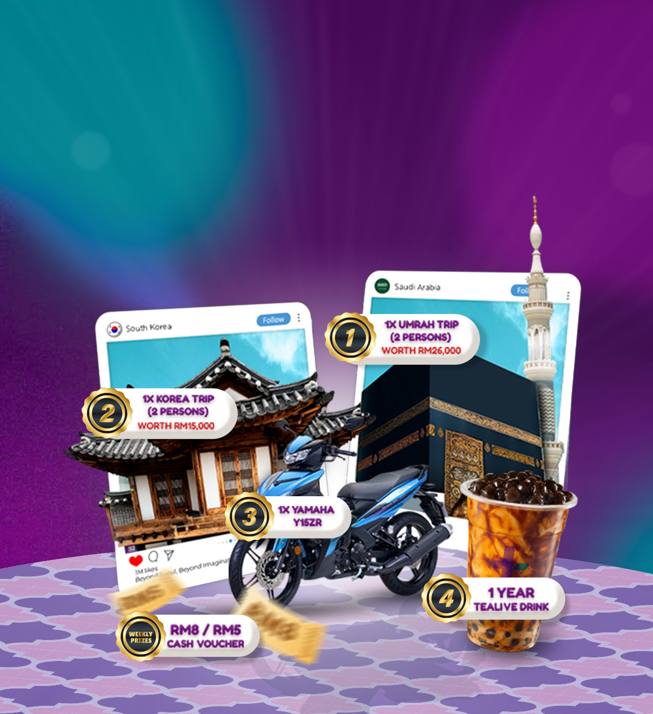 Spend RM15 at selected Tealive outlets and pay with DuitNow QR or MyDebit for a chance to win prizes up to RM80,000, including Tealive cash vouchers and Umrah trips.