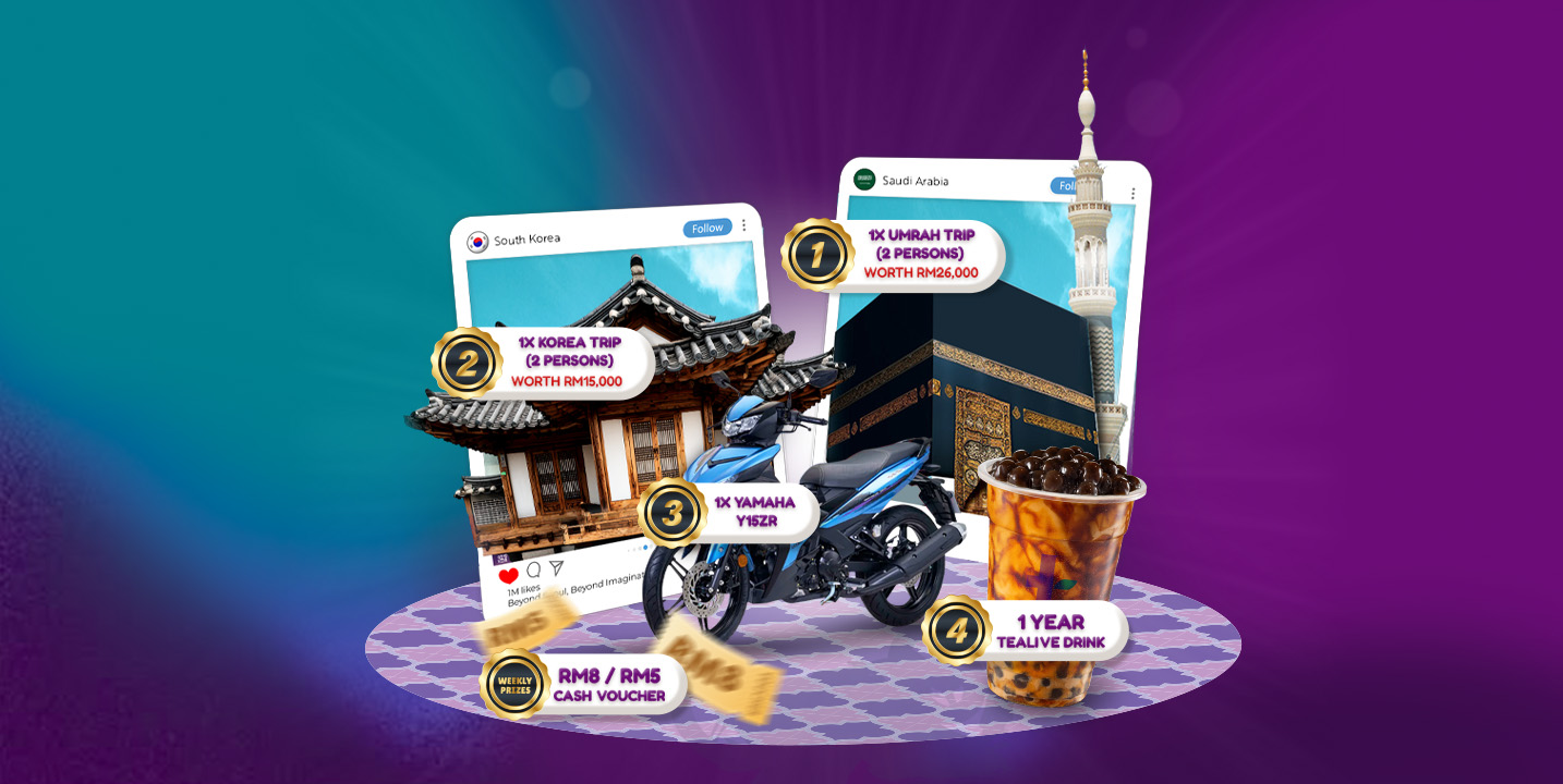 Spend RM15 at selected Tealive outlets and pay with DuitNow QR or MyDebit for a chance to win prizes up to RM80,000, including Tealive cash vouchers and Umrah trips.